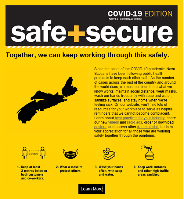 The November issue of our Safe + Secure e-newsletter is now available, with a focus on the need for Nova Scotians to continue to follow public health protocols like wearing masks, maintaining social distance, frequent hand washing, and all of the other practices that will continue to keep us safe as we work through the pandemic.