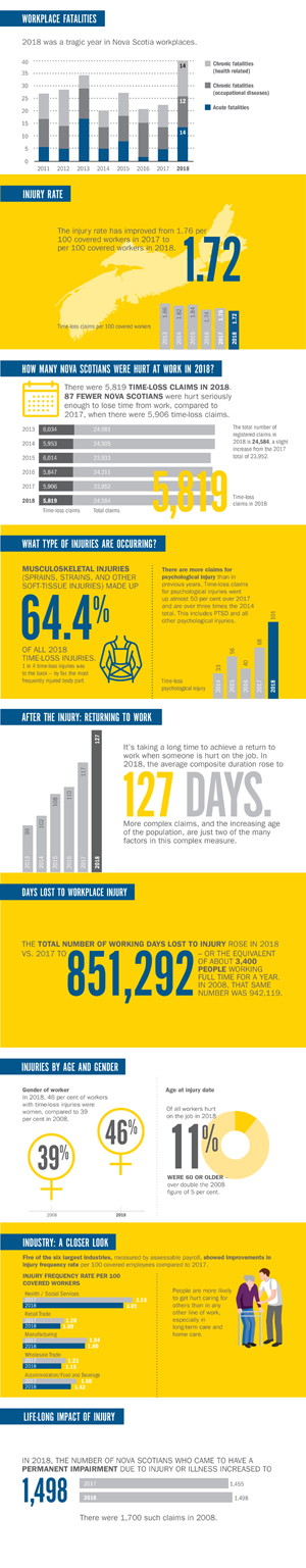 Also released today were WCB Nova Scotia’s statistical results from 2018. They show long-term progress in overall workplace safety, but challenges in returning to work after injury.